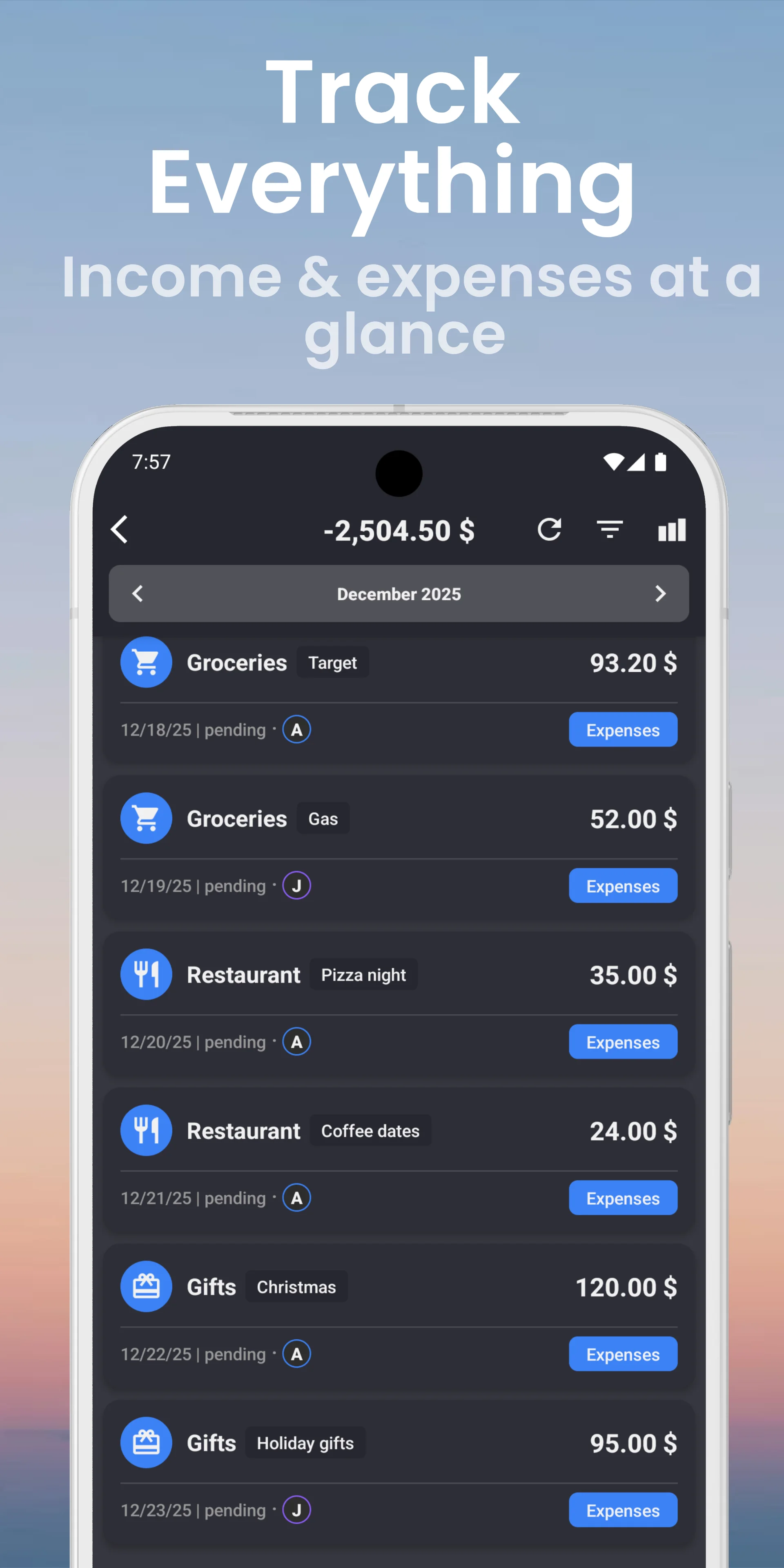 All changes sync instantly across all devices. Add an expense on your phone, and your partner sees it immediately on theirs. No more "did you add that?" questions.